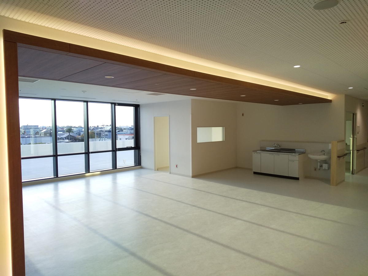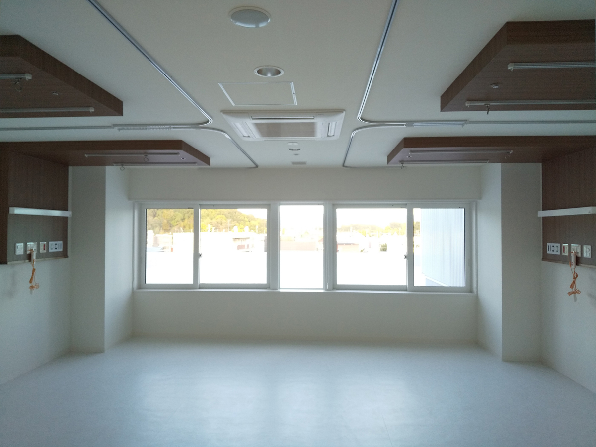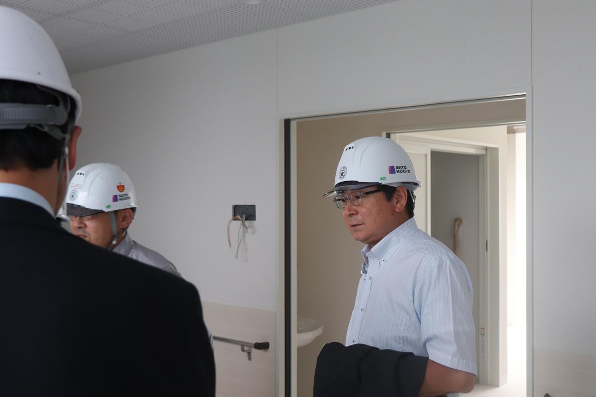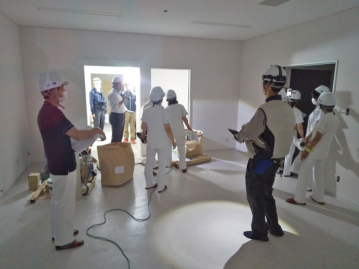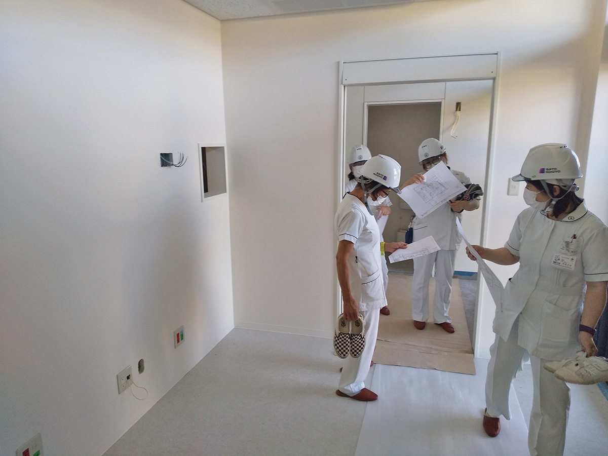 新病院の病室の広さやベッド周りの配置を実際に見て触って検討するため、既存病院5階病棟(閉鎖済)の一室に病室サンプルを作成。会議出席者が視察しました。